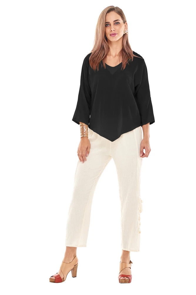 A cotton gauze V-neck top with delicate point detail at the bottom. A staple piece for your wardrobe.